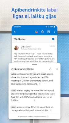 Šiuolaikiniame, sparčiai besikeičiančiame pasaulyje, efektyvus bendravimas ir planavimas yra raktas į sėkmę. „Outlook for Android" sukurta tam, kad Jūsų elektroninio pašto dėžutė taptų ne tik tvarkinga, bet ir išmaniai organizuota. Pamirškite nesibaigiantį laiškų srautą – su išmaniąja „Reikšmingiausių gautųjų" funkcija, svarbiausia informacija visada bus Jūsų akiratyje, atskirta nuo mažiau svarbių pranešimų. Vos keliais palietimais galėsite ne tik skaityti laiškus, bet ir iškart suplanuoti susitikimus kalendoriuje ar pasidalinti savo užimtumu, užtikrinant, kad svarbiausi įvykiai niekada neliktų nepastebėti.
